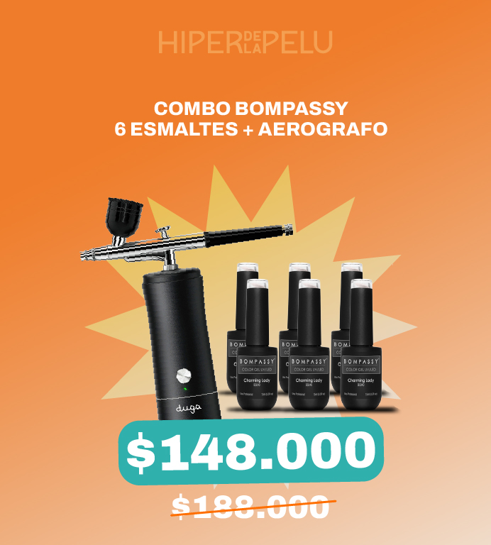 El combo ideal para crear diseños profesionales con acabado perfecto. Incluye seis tonos de esmaltes Bompassy y un aerógrafo Duga de alta precisión, pensado para lograr degradados, efectos artísticos y aplicaciones uniformes.