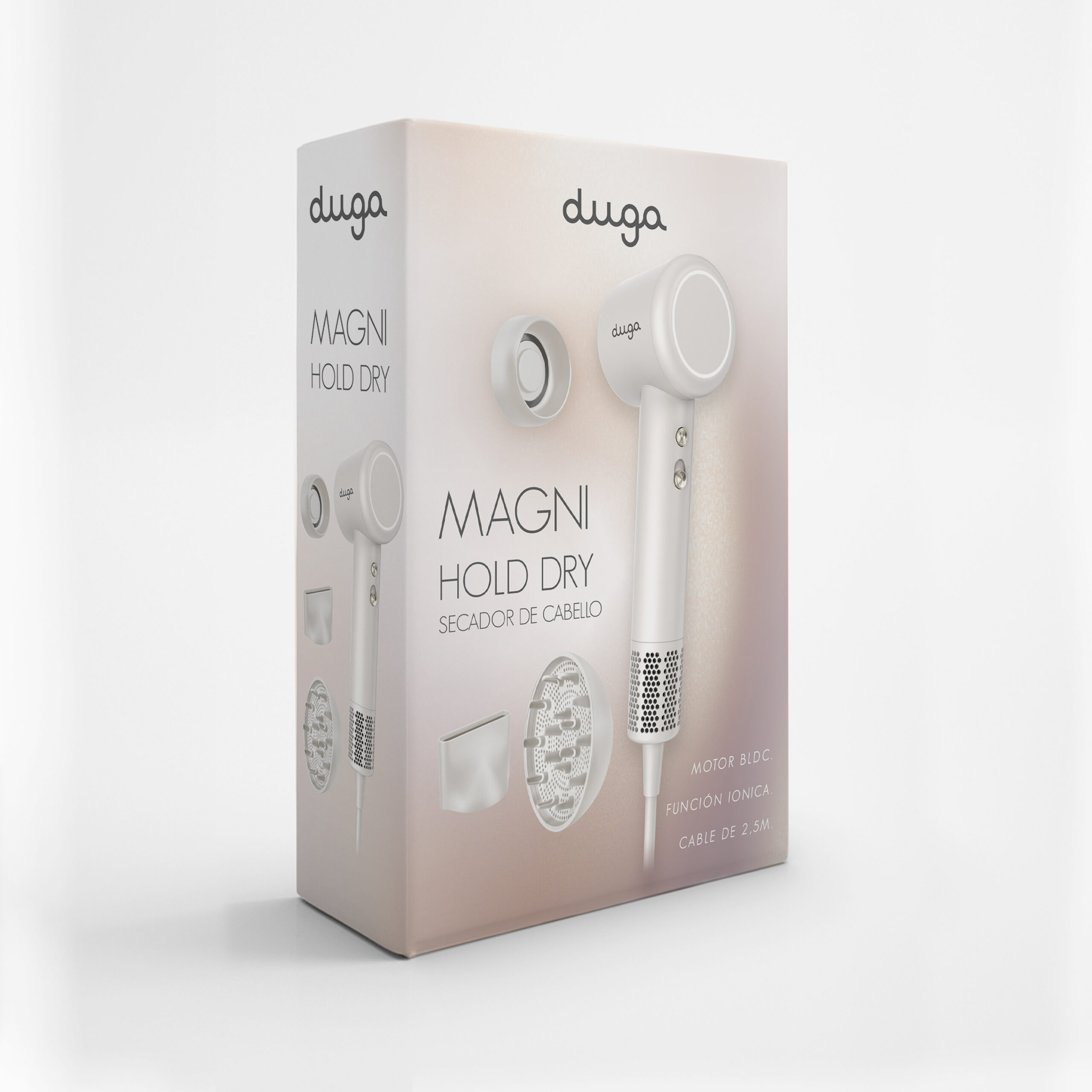 Secador Profesional Duga Magni Hold Dry D2 (High Speed) Experimenta el futuro del peinado con el Duga D2, un secador de alta velocidad que redefine la ergonomía. Con tecnología de flujo de aire magnético, motor ultrasónico potente y un cuerpo ultraliviano, ofrece un secado ultra-rápido con un nivel de ruido reducido y un control absoluto del frizz gracias a su emisión iónica avanzada.