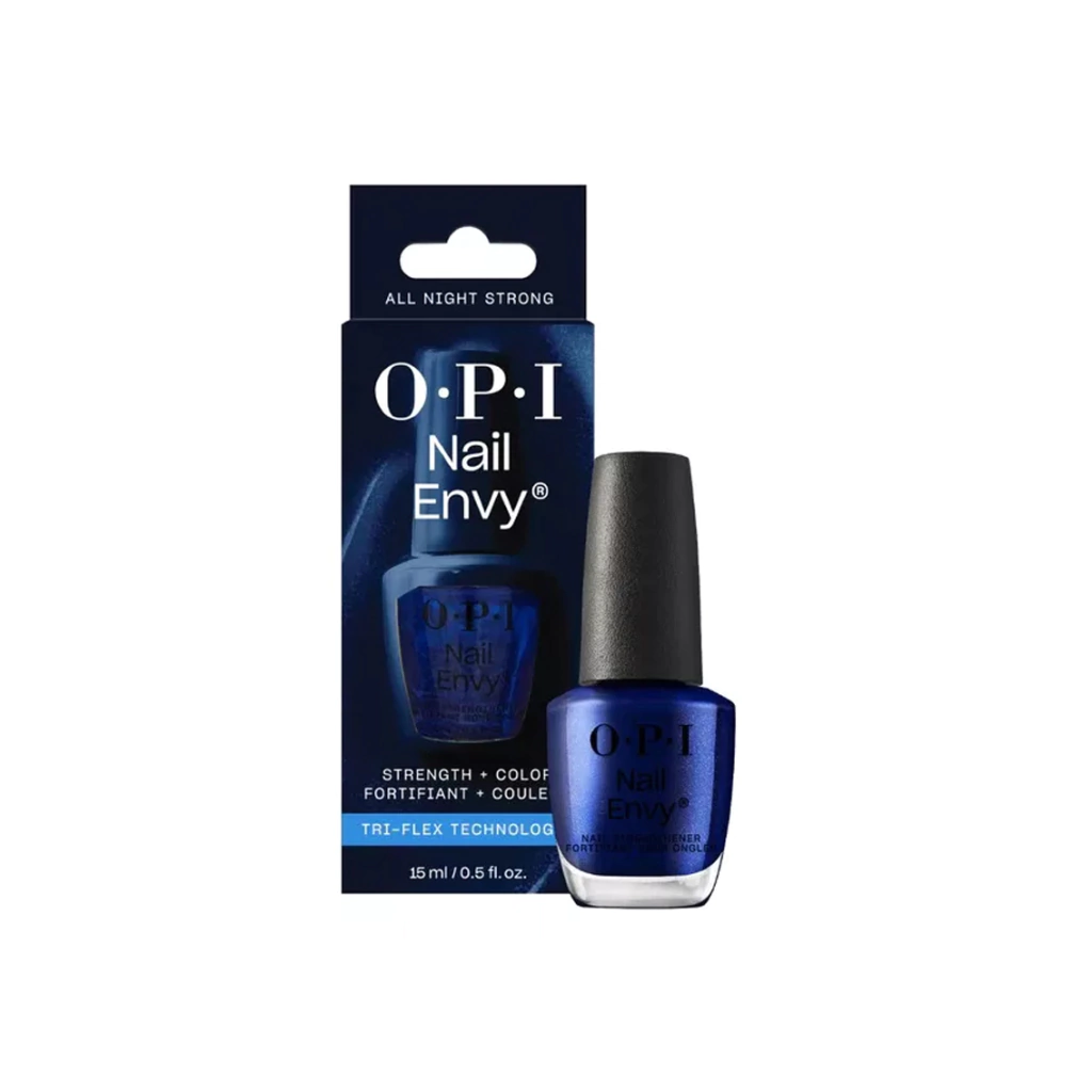 ¡Fortaleza extrema en el tono de la noche! El tratamiento OPI Nail Envy All Night Strong combina la icónica tecnología endurecedora Tri-Flex™ con un azul marino profundo y sofisticado. Enriquecido con biotina y vitaminas, logra uñas un 95% más fuertes en solo 7 días. Es la solución perfecta para transformar uñas débiles con un acabado de alto brillo y un color de tendencia.